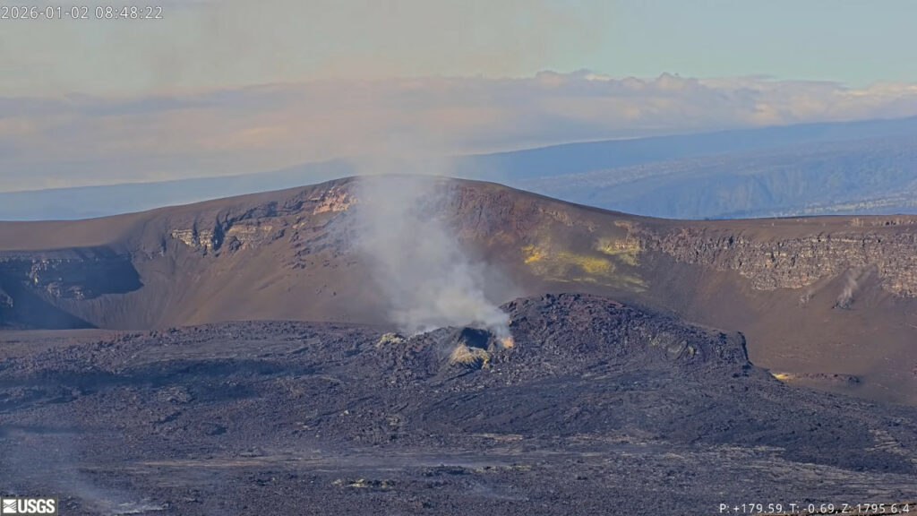 The ongoing Halemaʻumaʻu eruption is paused. Intermittent glow was seen from both vents overnight, with some spattering visible occasionally within the north vent. Kīlauea summit region showed slow inflation on tiltmeter UWD over the past 24 hours. Forecasting models suggest the window for lava fountaining episode 40 is between January 9 and 14. Kīlauea’s East Rift Zone and Southwest Rift Zone remain quiet.