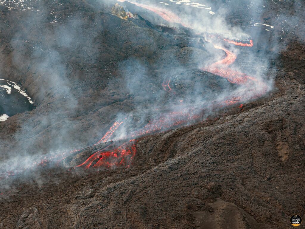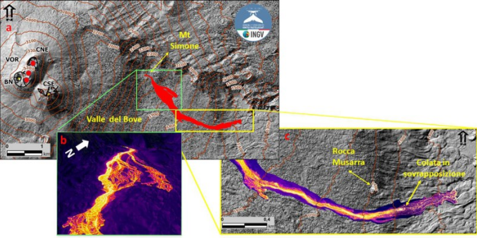On January 1st, at approximately 4:30 PM UTC, as weather conditions improved, surveillance cameras revealed effusive activity in the Valle del Bove. Based on field observations by INGV staff and satellite imagery, the lava flow was attributed to the opening of at least two eruptive vents just above Mount Simone, at an estimated altitude of approximately 2100 and 2050 meters. The effusive vents exhibited the typical morphology of hornitos, due to intense ejection activity. Around 6:00 PM UTC, the lava field was observed to be structured into several flows, with the most advanced front located immediately south of Rocca Musarra, at an altitude of approximately 1570 meters. On January 2, the lava field was well supplied and the most advanced front had reached an altitude of 1,420 m and a maximum length of about 2.80 km.