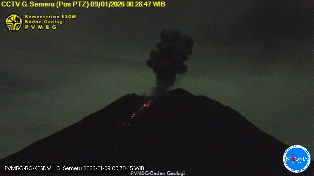 Mount Semeru erupted on Friday, January 9, 2026, at 0:28 a.m. WIB. An ash column was observed approximately 1,000 meters above the summit (at an altitude of about 4,676 meters). This column, white to gray in color and of moderate intensity, was drifting northward. At the time of writing, the eruption was still ongoing.