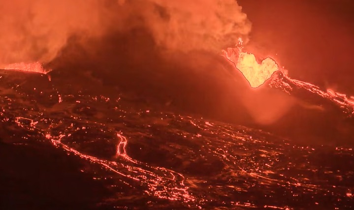 Des débordements quasi continus se sont poursuivis à l’évent Nord pendant la majeure partie de la journée d’hier et durant la majeure partie de la nuit dernière. Des fontaines en dôme intermittentes ont continué à se former à l’évent Sud au cours des dernières 24 heures et de la nuit dernière, alimentant des coulées de lave qui débordent de cet évent plusieurs fois par heure. L’activité à l’évent Nord a diminué après 3 h ce matin, la lave ne débordant plus que de manière intermittente. Ce matin, seules des projections sont visibles à l’intérieur de l’évent Nord et les importants débordements de l’évent Sud ont ralenti à environ un par heure, le dernier débordement s’étant terminé juste avant 9 h 10 HST. Les débordements de l’évent Sud continuent d’alimenter une coulée de lave active qui s’étend sur plus de 500 mètres (1 500 pieds) au fond du cratère Halemaʻumaʻu.