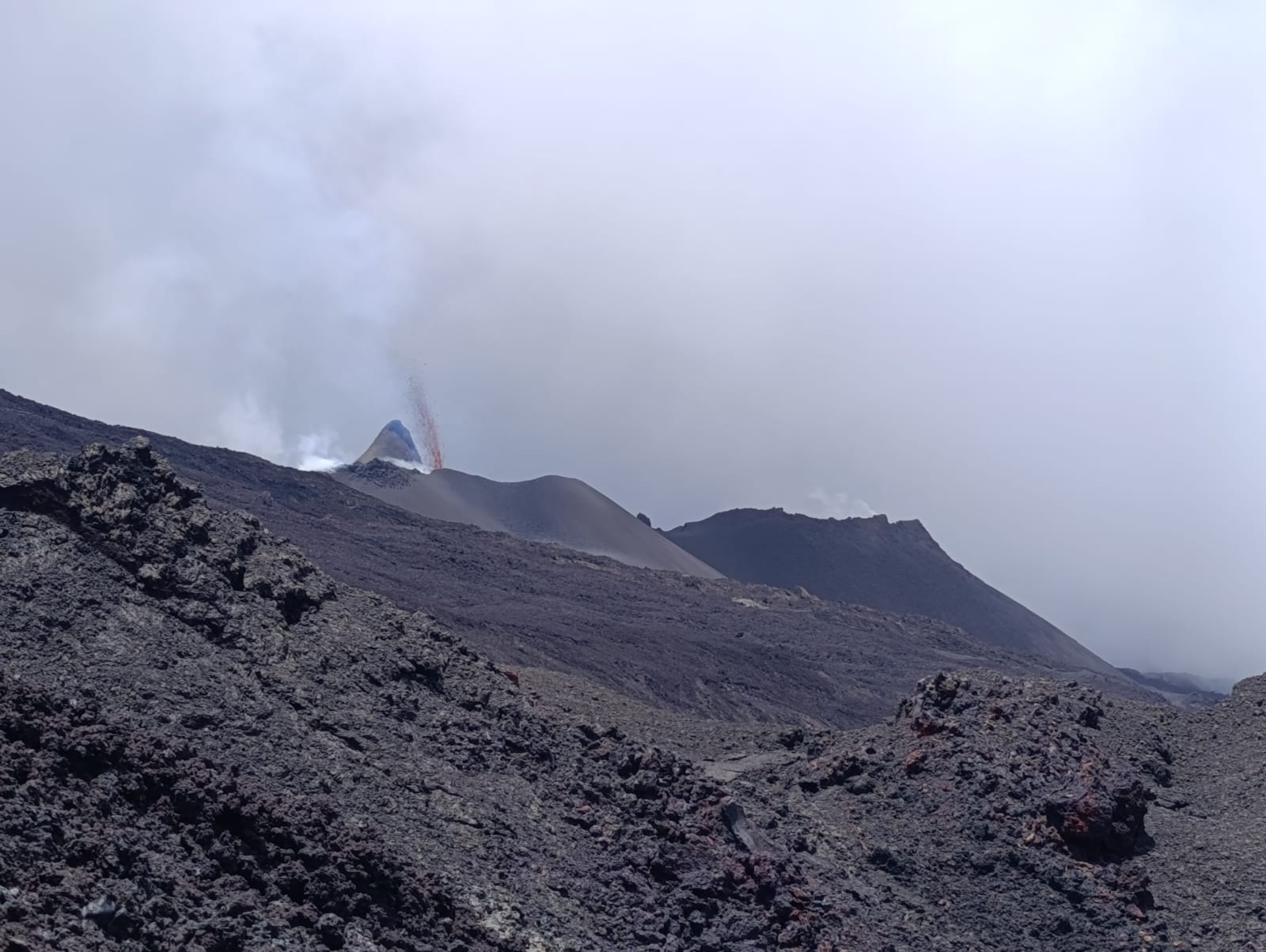 Only one eruptive site remains active on the south-southeast flank of the volcano, with fountains clearly visible from Piton de Bert.