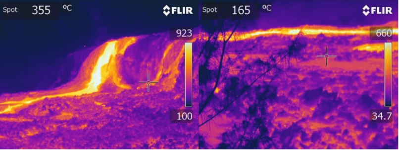 The lava field emitted from the eruptive site still forms two main arms. The front of the northern arm remains stationary approximately 2.6 km from National Route 2 (RN2), at an altitude of about 660 m. However, since yesterday, the northern arm has been fed again, and activity is visible in its upstream section (upper Grandes Pentes).