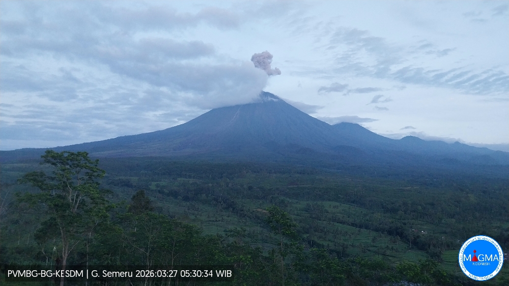 Mount Semeru experienced an eruption on Friday, March 27, 2026 at 5:27 AM WIB. An ash column was observed approximately 1,000 meters above the summit (at an altitude of about 4,676 meters). This ash column was gray and dense, oriented to the north and northeast. The eruption was recorded by a seismograph with a maximum amplitude of 22 mm and a duration of 168 seconds.